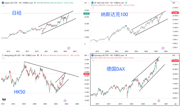 美国三大股指上周高位回落,欧洲和亚太股指则涨跌不一。从周线级别来看,全球主要股指都面临着不小的上行压力。